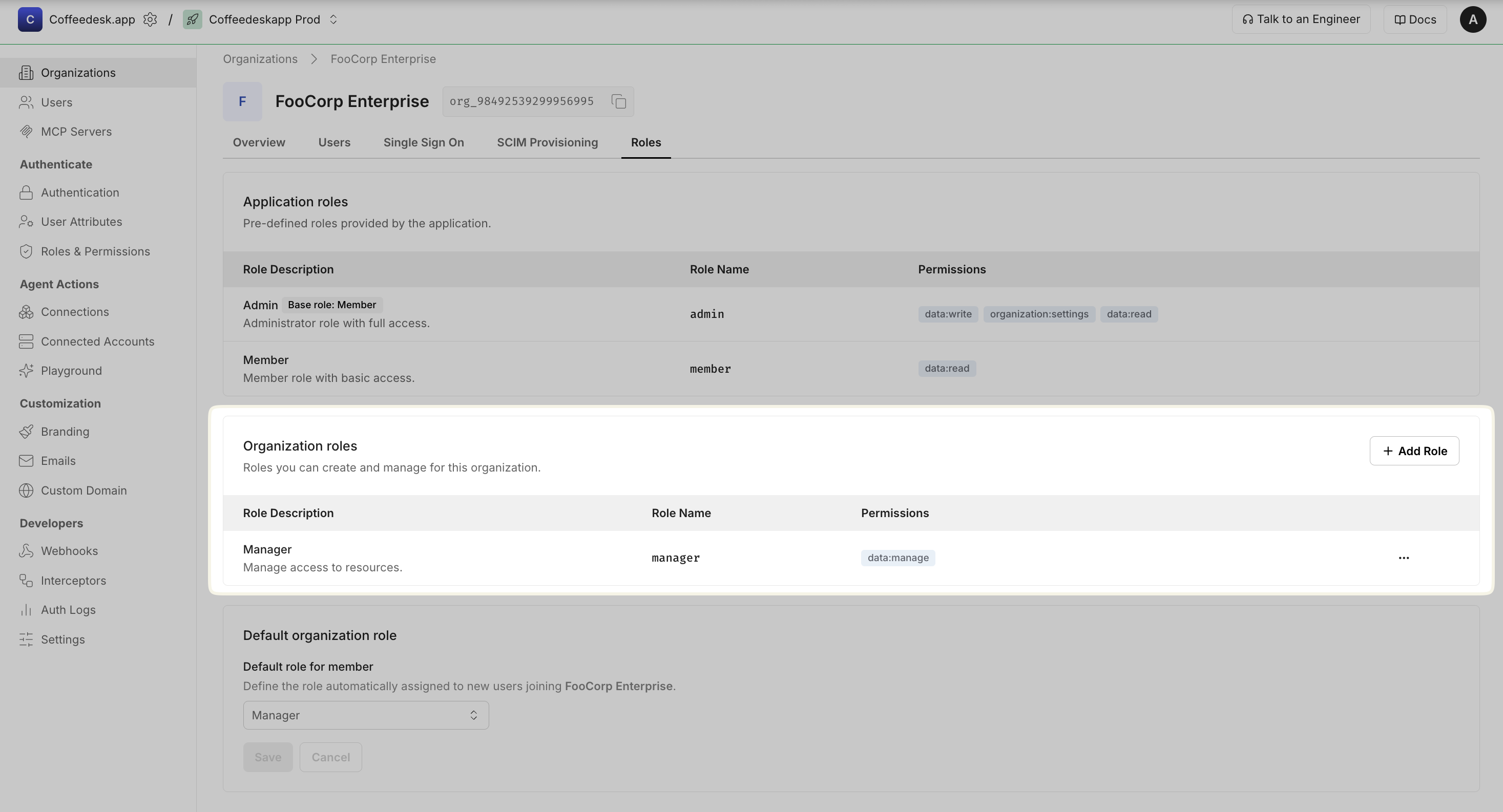 Section titled “Configure organization specific roles”Organization-level roles let organization administrators create custom roles that apply only within their specific organization. These roles are separate from any application-level roles you define.